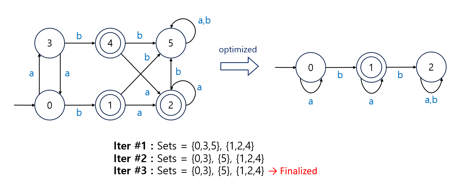 이렇게 만들어진 DFA는 최적화가 필요할 수도 있는데, 일부 DFA는 동일한 행동을 하는 state가 중복으로 나타날 수도 있기 때문이다. state가 많아지면 table size에 영향을 미치고 메모리를 차지하여 성능에 문제가 생길 수 있다. 만약 두 state가 input symbol에 대해 똑같은 state로 전이된다면, 구분할 수 없다고 보고 병합해야 한다. 이를 위해 다음과 같은 반복적인 절차를 거칠 수 있다.