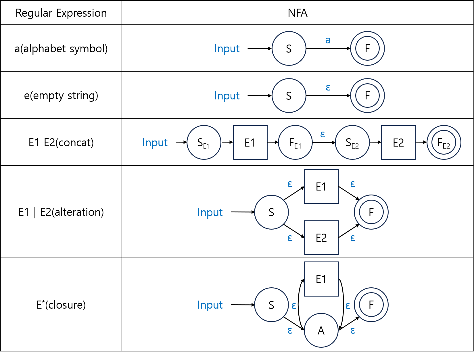Thompson's construction algorithm은 자동으로 RE를 NFA로 변환한다. 이 알고리즘은 RE를 가장 단순한 요소로 나누고, 그 요소에 해당하는 NFA를 만들어 결합해 나감으로써 최종적인 NFA를 생성한다. 결합은 ε 전이를 통해 이루어질 수 있다. 저번 글에서 RE를 정의하기 위한 5가지 규칙(a, ε, concat, alteration, closure)에 대해 알아보았다. 이에 대한 NFA는 아래와 같다.