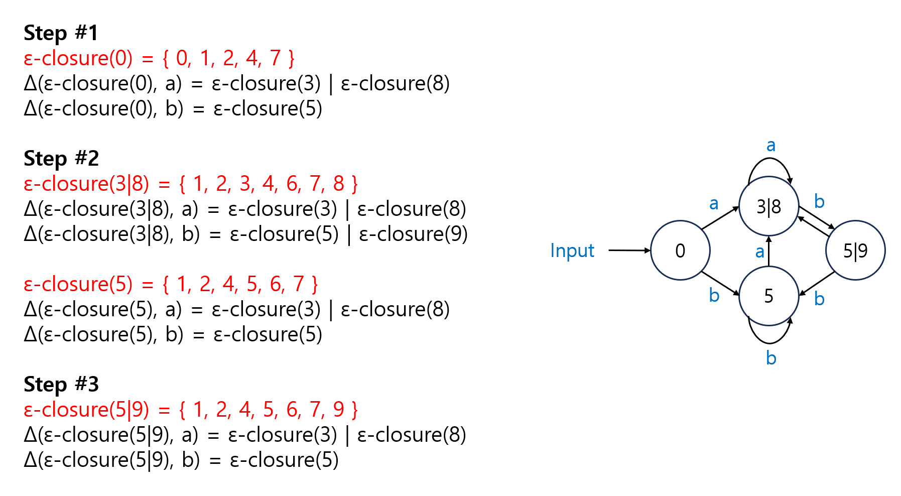 이 알고리즘의 기본 개념은 DFA의 각 state는 NFA의 여러 state를 묶은 집합일 수 있다는 것이다. NFA에 0, 1, 2라는 state가 존재한다면, DFA의 state는 0/1/2, 1/2와 같은 형태로 이루어질 수 있다. 여기서 포함하는 집합 중 하나라도 accepting state라면 DFA에서도 accepting state로 취급한다. ε 전이를 처리하기 위해선 아래와 같은 연산을 사용할 수 있다.